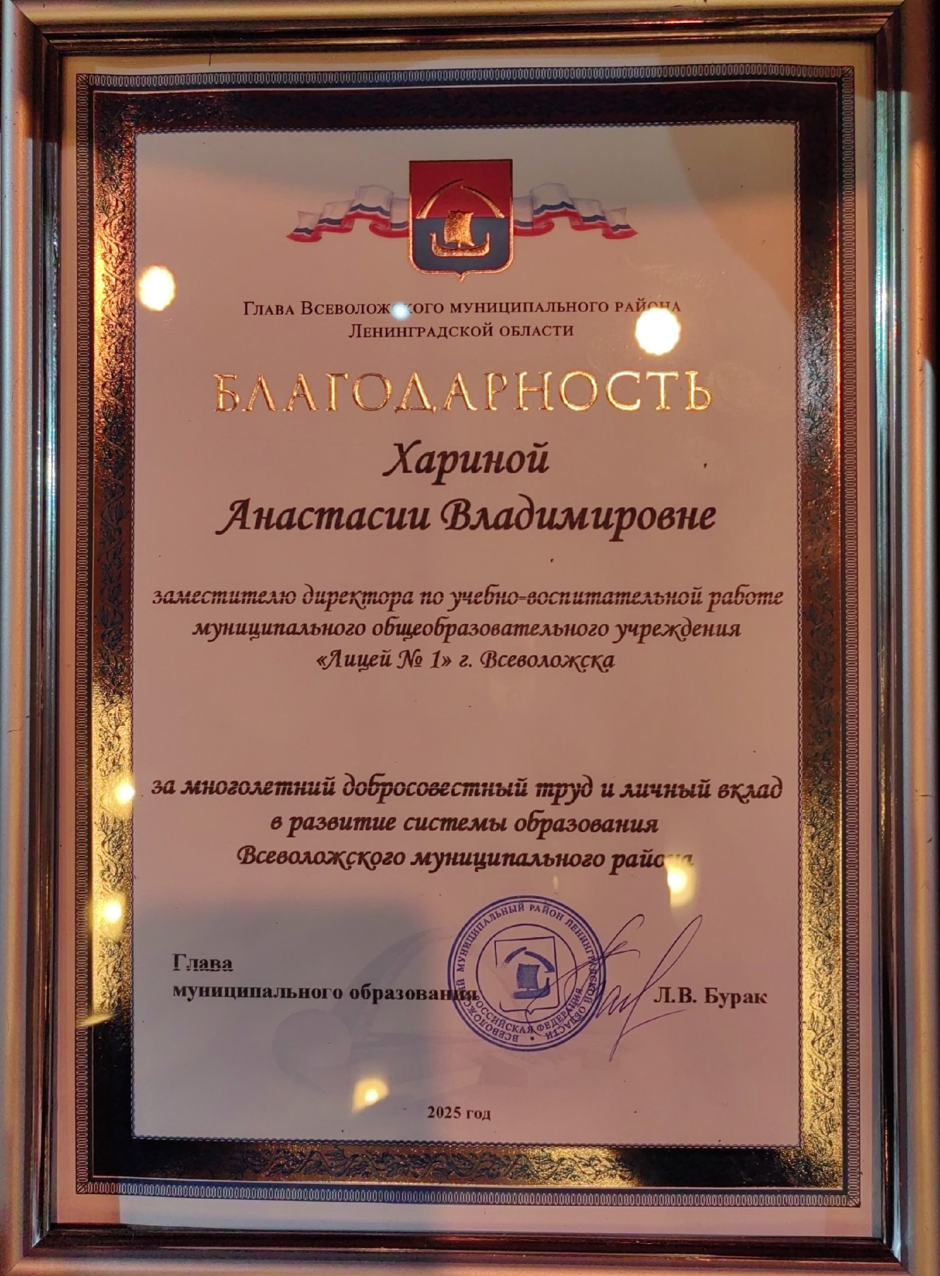 Анастасия Владимировна Харина, заместитель директора по УВР нашего лицея, была удостоена Благодарности главы города Всеволожска за многолетний добросовестный труд и личный вклад в развитие системы образования! Это признание — абсолютно заслуженная оценка профессионализма, преданности делу и невероятной энергии!